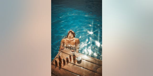 On the brand’s Instagram page, Wilde poses topless while tilting her head back in a pool and again while covering her arms with her chest as she gazes into a mirror.