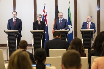 Industry and Science Minister Ed Husic, Foreign Affairs Minister Penny Wong, Prime Minister Anthony Albanese and Trade and Tourism Minister Don Farrell.Credit:Alex Ellinghausen